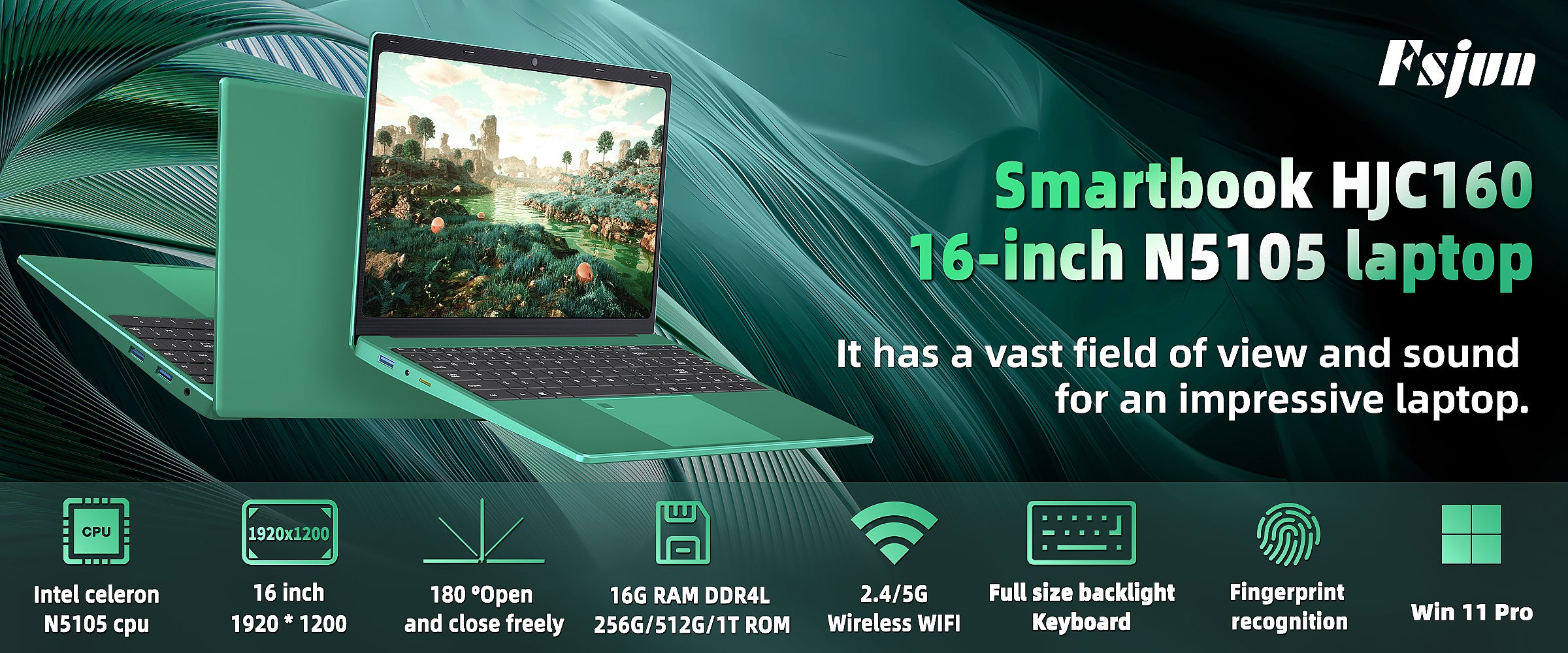 16" Green Laptop, Celeron N5105 CPU, DDR4 16GB RAM 256GB/512GB/1TB SSD, FHD IPS Display, Backlit KB,Fingerprint Unlock, USB 3.0, HDMI, WiFi/BT, Perfect for Work, Study and Play! (Green)