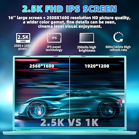 16" Blue Laptop,Ultra-Narrow bezels 2.5K QHD(2560x1600) IPS,Celeron N5095,16G RAM 256GB/512GB/1TB SSD, Color Backlit KB, Fingerprint,Type-C/HDMI/WiFi/HDD Expand, Win 11 PC for Business Study